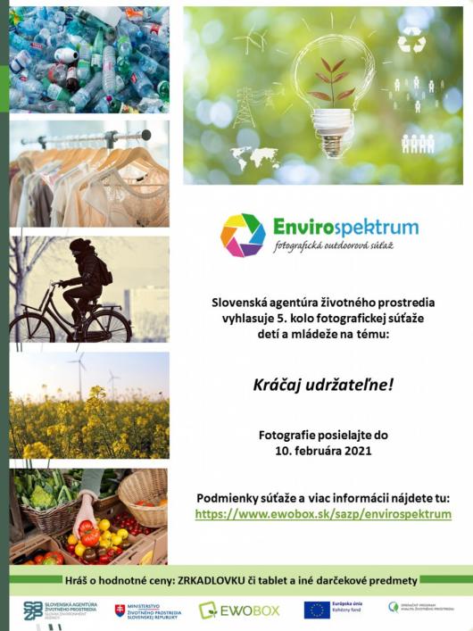 Kráčaj udržateľne! Vyzývajú organizátori zo Slovenskej agentúry životného prostredia najmladšiu generáciu prostredníctvom 5. kola súťaže Envirospektrum. Svoje udržateľné kroky a kroky ich bezprostredného okolia majú za úlohu opäť zaznamenať prostredníctvom fotoaparátu. O šetrení zdrojov, stratégií udržateľnosti a ohľaduplnosti k všetkému živému navôkol totiž nestačí iba hovoriť, je potrebné konať.